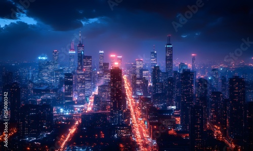 © dewpra, Fototapeta premium Nighttime cityscape with vibrant lights and dark clouds above a high-rise buildings