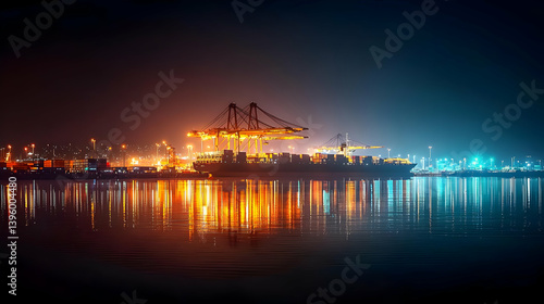 © artzone, Obraz premium Nighttime Container Port With Crane Reflections