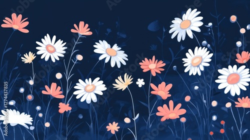 © lestari, Obraz premium Nighttime daisies field, floral banner, dark background, website header