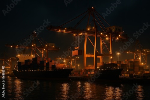 © Pleng, Fototapeta premium Nighttime Dock Operations at a Cargo Port with Illuminated Cranes