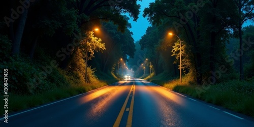 © Nova, Fototapeta premium Nighttime Drive Through a Serene, Tree-Lined Road Illuminated by Soft Lamplight