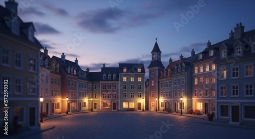 Naklejka premium Nighttime European Style Town Square with Illuminated Buildings and Cozy...