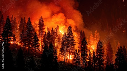 © elmyra, Fototapeta premium Nighttime forest fire. Silhouette of towering pine trees against a backdrop of intense orange and yellow flames and smoke. The fire's glow illuminates the night sky