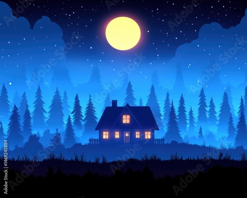 © Lema, Fototapeta premium Nighttime forest scene with cozy cabin