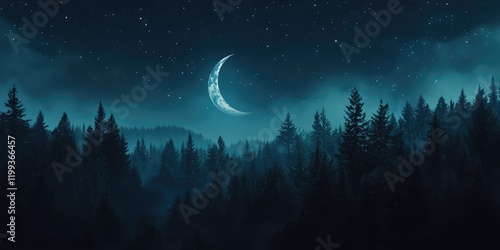 © ArtificialHorizons, Naklejka premium Nighttime Forest Scene with Moon and Evergreen Trees, Starry Sky, Suitable for Seasonal Text Overlay, Cool Blue and Green Tones