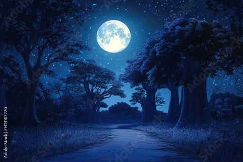 Fototapeta premium Nighttime forest with bright full moon and starry sky in a tranquil setting