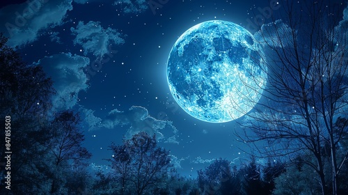 Fototapeta premium Nighttime, full moon, high in the sky, deep blue sky, moonlight, clouds, tree...