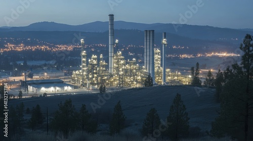 © NashEmpire, Obraz premium Nighttime Industrial Plant with Bright Lights and Dark Mountains