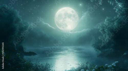 © Drap, Fototapeta premium Nighttime Lake with Full Moon and Stars Illustration