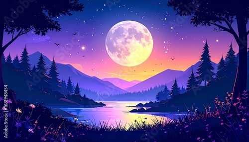 Naklejka premium Nighttime landscape with a large moon