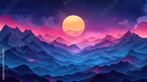 Fototapeta premium Nighttime mountain valley with a bokeh background featuring the moon Nighttime mountain valley with bokeh background and moonlight