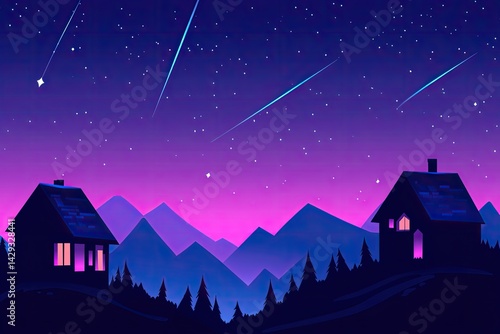 © Garage art, Fototapeta premium Nighttime mountain village with shooting stars
