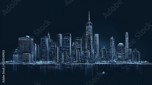Obraz premium Nighttime New York City skyline sketch, showing skyscrapers and water reflection. Possible use Background image