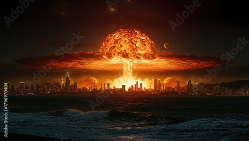 Obraz premium Nighttime nuclear explosion over coastal urban landscape, safety risks...