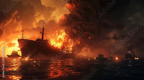 Fototapeta premium Nighttime Oil Tanker Sinking with Emergency Flares and Rescue Operations at Sea