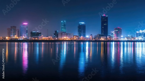 Fototapeta premium Nighttime panorama of Manama, Bahrain, highlighting the glowing Four Seasons and Hilton Hotels in the city's vibrant skyline