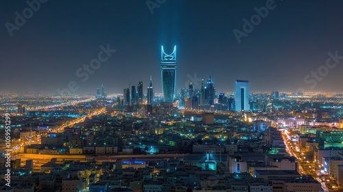 Naklejka premium Nighttime Panorama of Riyadh Cityscape with Illuminated Skyscrapers