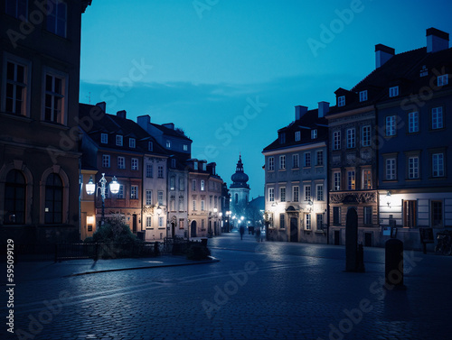 © Uolir, Fototapeta premium Nighttime Photo of Polish City in the Style of Old Town Warsaw - generative AI