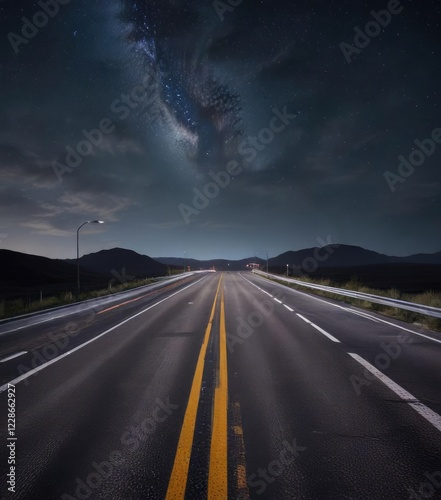 Fototapeta premium Nighttime photography of a deserted highway under starry sky, auopista...