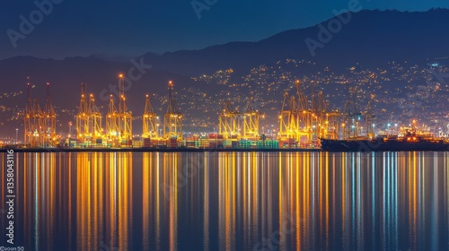 © Berkah1789, Fototapeta premium Nighttime Port Illuminates Container Cranes and Cargo Ships