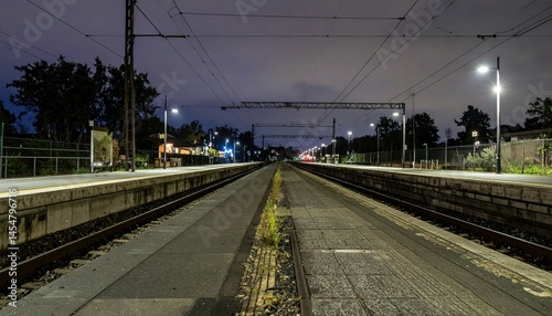 Naklejka premium Nighttime railway station platform illuminated by street lights and moon