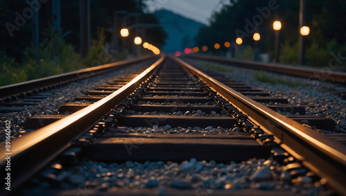 © Anuyj, Fototapeta premium Nighttime railway tracks stretching into the distance