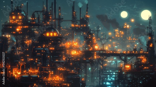 Fototapeta premium Nighttime Refinery Landscape: A Network of Lit Pipes and Machinery