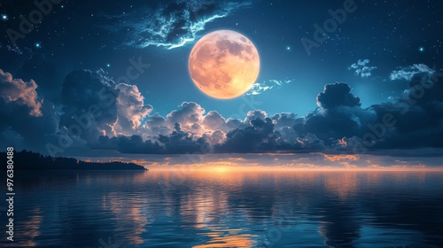 Fototapeta premium Nighttime reflection of a full moon over a calm lake with city lights in the...