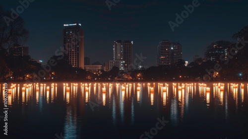 Fototapeta premium Nighttime reflection of city lights on water urban landscape photography serene environment night view cityscape illumination