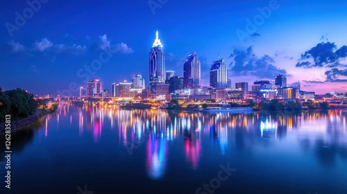 © 69, Fototapeta premium Nighttime Reflection of City Skyline with Illuminated Buildings and Calm Water Surface