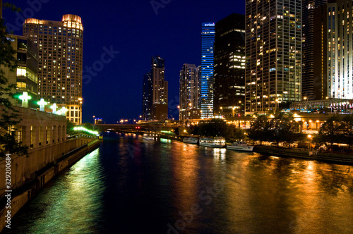 Fototapeta premium Nighttime reflections of the Chicago city skyline in the Chicago River.