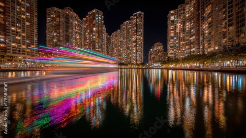 © Kristina, Obraz premium Nighttime river city landscape with colorful light streaks reflected in the water and skyscrapers providing an illuminated backdrop.