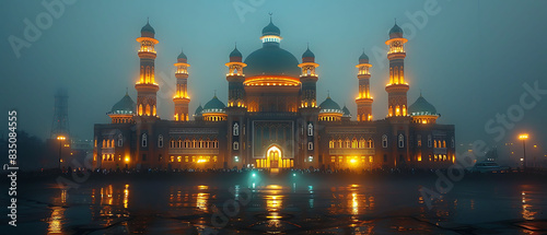 © Premium Graphics, Fototapeta premium nighttime scene of mosque illuminated domes minarets people gathering for EidalAdha prayers captured with long exposure to create a glowing serene effect using advanced lowlight photography techniques