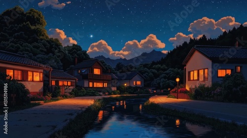 Fototapeta premium Nighttime serenity illustration of houses by canal with illuminated windows and starry sky