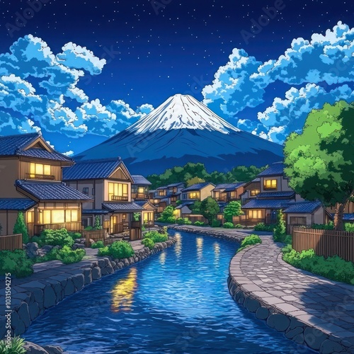 © Tuong, Naklejka premium Nighttime Serenity: Japanese Village with Buddhist Temple and Shinto Shrine, Featuring Mount Fuji in Dark Fantasy Anime Comics Artstyle