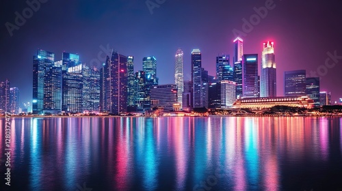 © SyabilaSyifa, Fototapeta premium Nighttime skyline with towering skyscrapers, vibrant lights, metropolitan feel