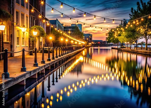 Fototapeta premium nighttime string lights twinkling reflections calm water peaceful Charleston dock street romantic evening ambiance