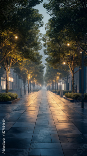Obraz premium Nighttime stroll along a tree-lined street illuminated by warm lights in a...