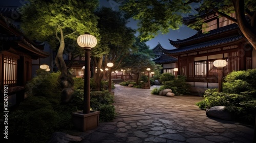 Fototapeta premium Nighttime Stroll Through a Serene Japanese Garden