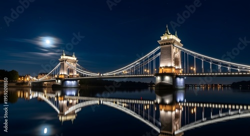 © Ardiyanto, Fototapeta premium Nighttime suspension bridge over water with illuminated structures and sky reflection