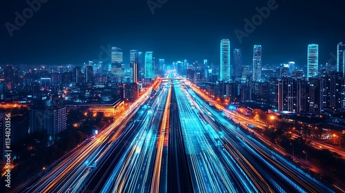 Fototapeta premium Nighttime traffic flow in urban cityscape long exposure photography