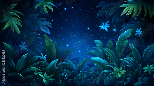 © Lailatul, Fototapeta premium Nighttime tropical jungle foliage with stars twinkling, used for wallpaper or educational background illustration
