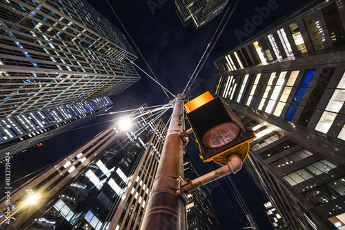 Fototapeta premium Nighttime upward view of towering glass buildings converging above a glowing traffic light, creating a dynamic sense of motion