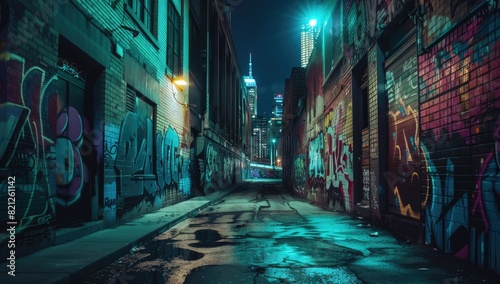 Obraz premium Nighttime Urban Alley with Graffiti Art