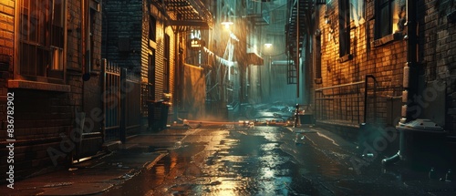 Fototapeta premium Nighttime urban alleyway with atmospheric lighting lamp