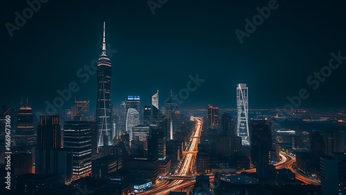 Fototapeta premium Nighttime urban landscape with illuminated skyscrapers and light trails,...