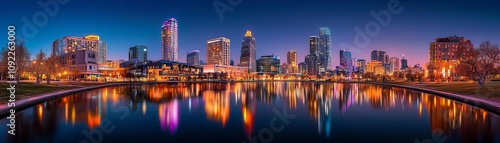 Fototapeta premium Nighttime urban skyline with a vibrant river reflection