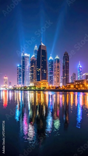 Fototapeta premium Nighttime Urban Skyline with Reflections on Dark Water Tall Buildings Illuminated by Blue Spotlights Creates Striking Visuals