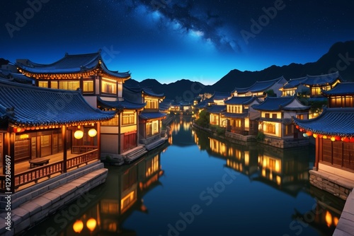© haiqiang, Fototapeta premium nighttime view of a canal with a building and a bridge