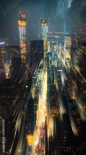 © Ibnu, Fototapeta premium Nighttime View of a Cityscape with Brightly Lit Buildings and Blurry Light Streaks
